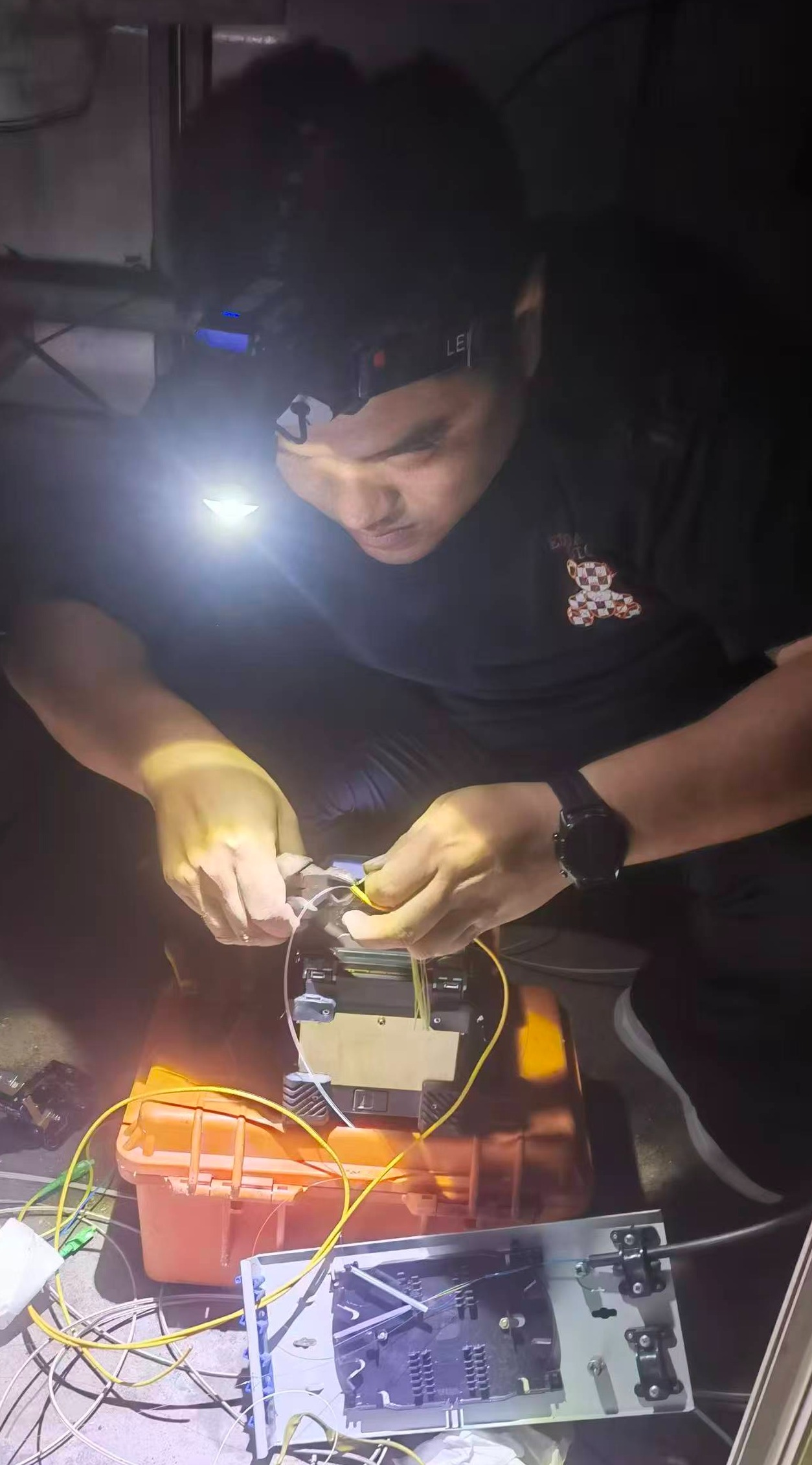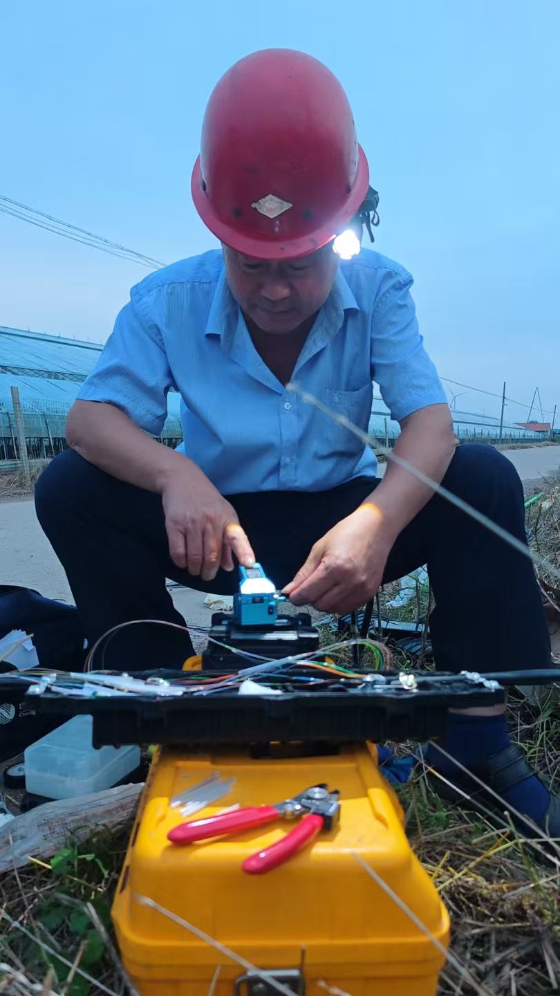 假期期間,濰坊安丘市大盛、吾山片區(qū)突發(fā)整體故障,安丘市分公司迅速行動(dòng),組織公司骨干迅速趕往現(xiàn)場(chǎng)搶修,圖為技術(shù)工程部員工劉梅光在熔接光纜。