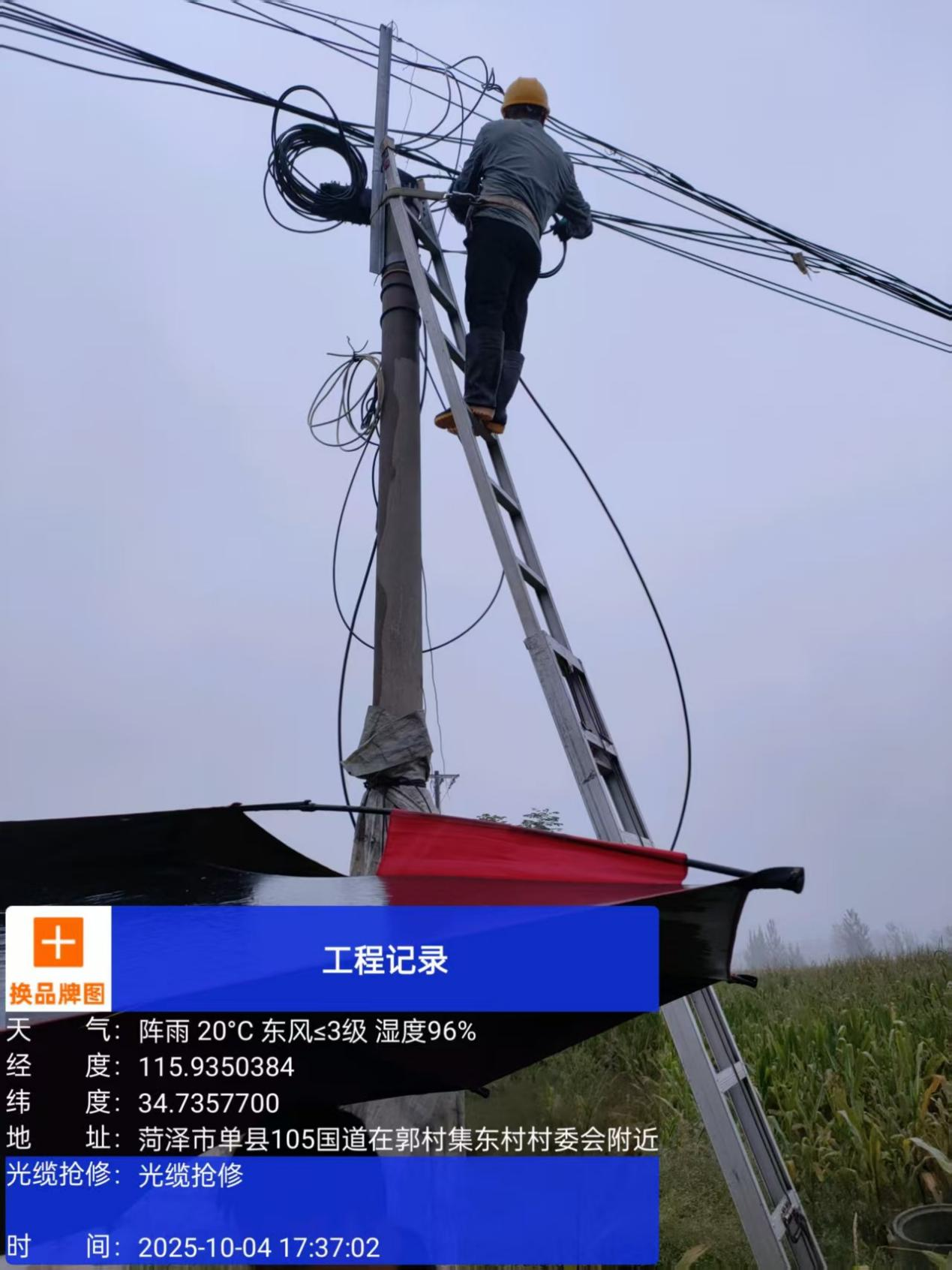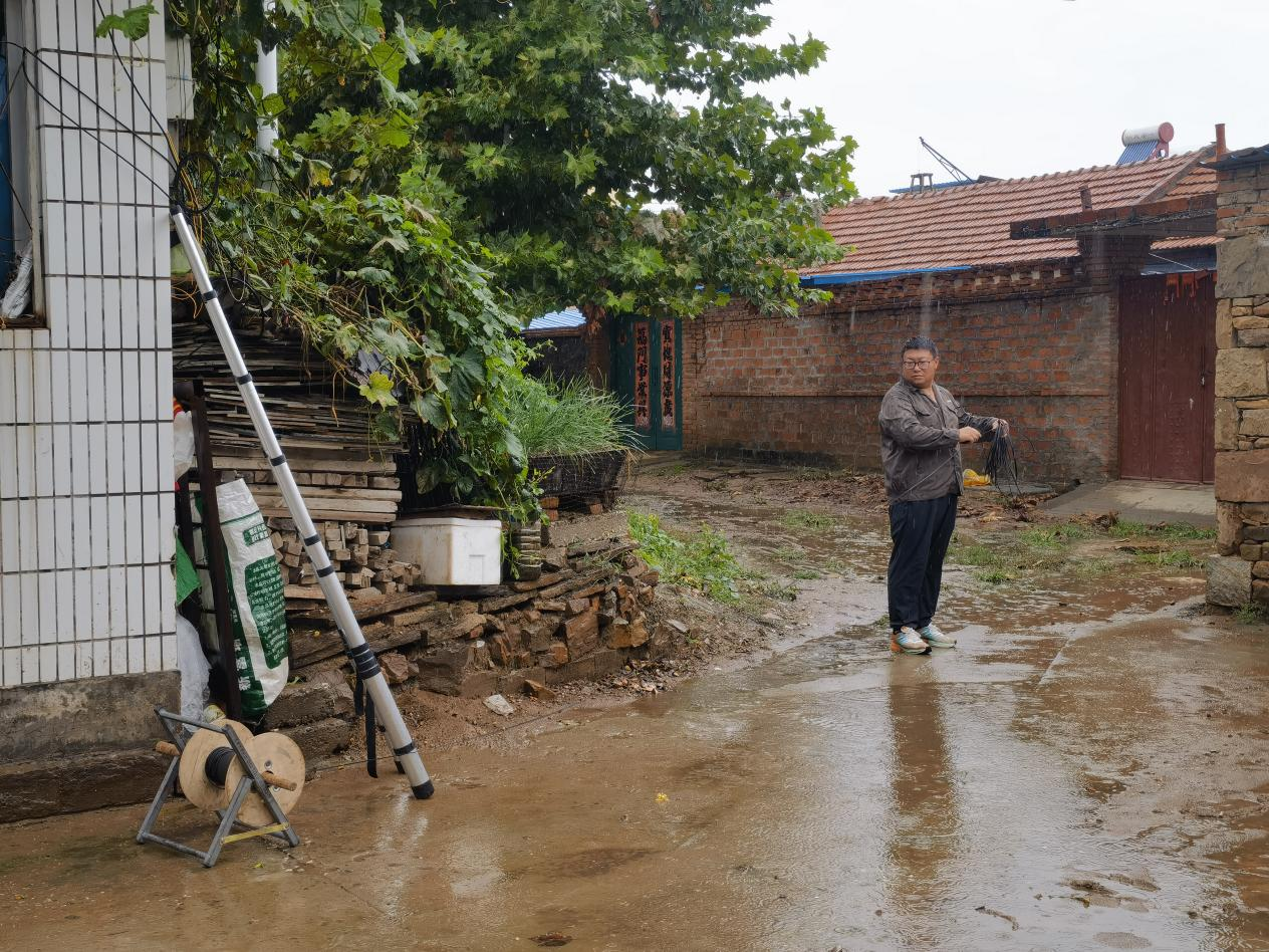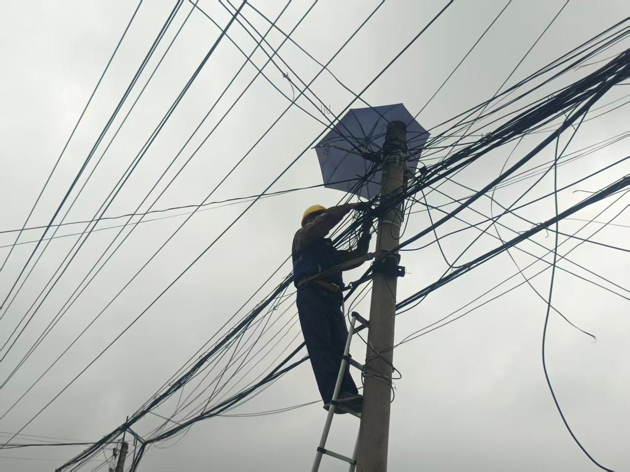 10月6日,日照五蓮分公司于里鎮(zhèn)趙家辛莊村線路故障全村無信號(hào),網(wǎng)格經(jīng)理徐鳳杰冒雨搶修。