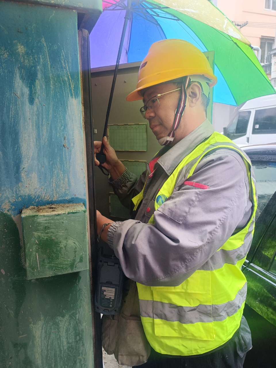 國慶假期,濟(jì)南市中區(qū)分公司莊緒文冒雨搶修民族大街9號(hào)院信號(hào)低故障。